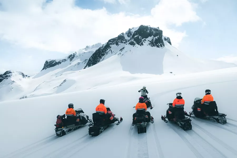 Scandinavian breakfast buffet at hotel (07.00-10.00) KL. 09.00-09.30 Hotel check out and transfer to National Park. KL. 09.30-12:00 Golden Circle Experience: Thingvellir National Park. Geyser. KL. 12:00-12:45 Transfer to greenhouse for lunch. KL. 13.00 Visit Friðheimar greenhouse incl. Tomato soup lunch served on a buffet with home baked bread, sour cream, cucumber salsa, butter and fresh basil Golden Circle Experience: Gullfoss and Stork Geyser KL. 14.00 3hrs Snowmobiling Adventure on Langjökull Glacier KL. 17.00 transfer to Reykjavik KL. 18.00 Local 3 course dinner incl. coffee/tea Potturinn Onion soup Pork Tenderloin Chocolate cake KL. 19.30 check in at hotel The long distance coach service ends at hotel.Snowmobiling Adventure on Langjökull Glacier